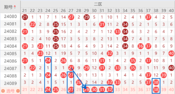 上期的连号空一带号24 26 27号数字没能出重号,本期我们注意一下回补一个号码的情况,重点关注一下24 27号数字出一个号码的情况,其中的24号数字是属于空一对称号码,出号机会很大。本期的30 35号数字我们注意出一个号码的情况,鉴于前几次都没有出号,本期我们做一下防守就行了。上期开出了32 33号数字,本期我们注意一下出一个重号的情况,重点关注一下32号数字走重的情况。本期的38号数字我们防守一下走重的情况,本期的32不出,那么本期的28 38就有机会出重了。