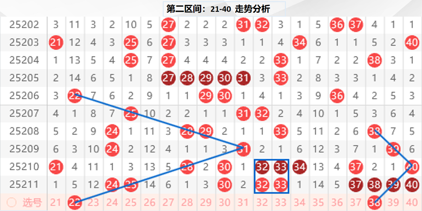 二区分析:【21-40】(走势图标注号码非小黄车大底,请谨慎参考,具体思路将在直播间分享讨论)