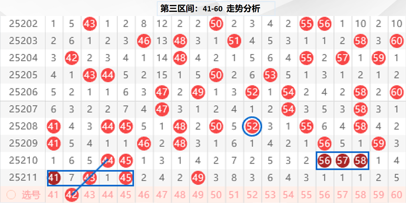 三区分析:【41-60】(走势图标注号码非小黄车大底,请谨慎参考,具体思路将在直播间分享讨论)