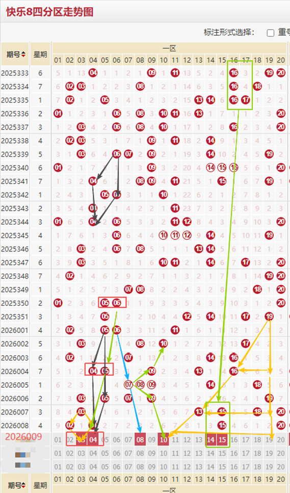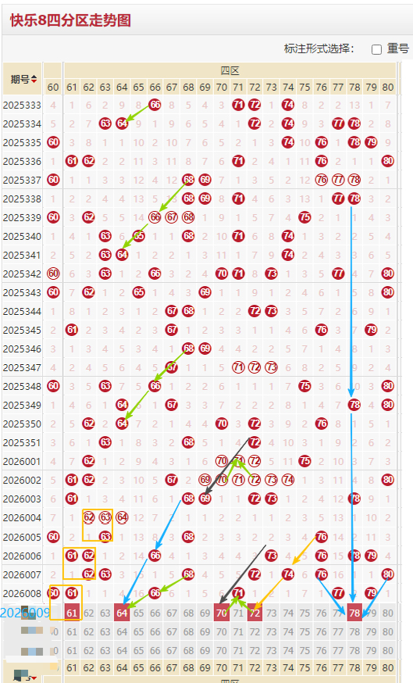 四区解析取号:我们将快乐八80个号分成四等区,一区01-20、二区21-40、三区41-60、四区76-80。