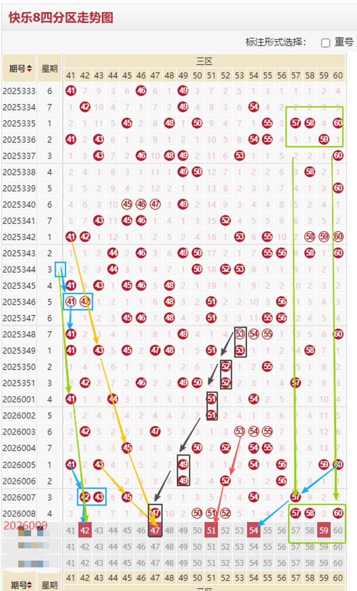 上期三区开出6个号码012578尾,本期看好出2-3个号,开出50 51 52三连号。