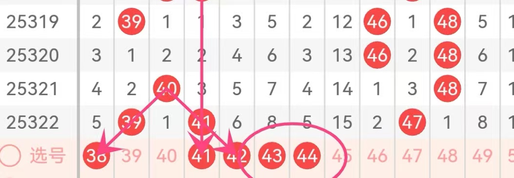41-50区域:近三期出号数量为2.1.2,本期该区域推荐关注号码为:41.42,这里需要预防43.44,或44.45以连号形式出现