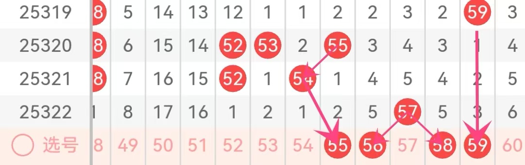 51-60区域:近三期出号数量为:3.2.1,本期该区域推荐关注号码为:55.56.58,需要预防58.59的连号组合,前几期提示该组合守号6期左右可以出现,目前3期
