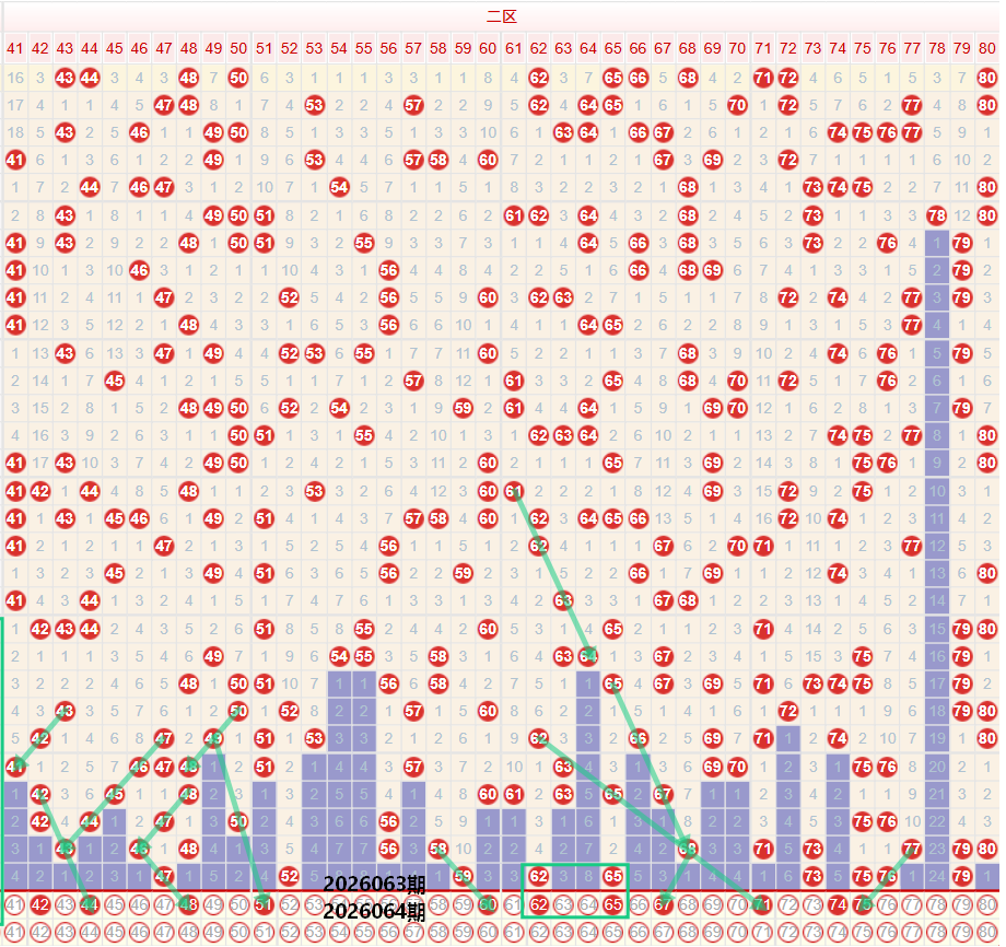 如图所示:在本期大数区的选号中注意在上期的走势中三区间开出了3枚中奖号码,再次落位在区间的最低位走势,4字头的号码出现了断点走势,本期注意上期三区间尾部开出的号码向4字头的号码出现延续走势,以及在上期47出现梅花走势,47出现了47的遗漏一期连续三期的走势,本期注意相同形态的48号,另外需要注意在近期的三区间走势中,多次出现单码下方出现分双边的走势,在上期开出47 52的位置注意,再次出现分分边的走势,个人较为看好51 53的双码走势,尾部位置在上期开出59的冷号回补走势,以及形成的斜线第二期走势,本期注意60的斜线第三期走势,或者是考虑59的重号走势,四区间上期开出了6枚中奖号码,落号形态依旧保持着较为常见的同路多码走势,6字头开出了59 62 65三码走势,7字头开出了73 76 79的三码走势,本期注意在单组号码中选择双码的重号形态,个人较为看好62 65的双码走势形态,以及这里要注意上方68的均线四期走势,本期的69第五期走势,如果不考虑第五期走势,则要注意边上的奇数号码67 71,7字头号码上期开出了75 76的遗漏一二连走势,本期注意74的夹号走势,或者是74 75的二连走势。