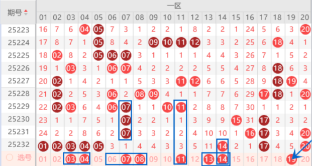 该区间上期开出了01 02 03 04 05号数字的五连号,本期我们注意一下出重号的情况,其中的01 03号数字我们可以重点关注一下出号情况。本期的06 07 08号数字是属于重号07号数字的边号回补,本期我们防守出一个号码的情况,其中的07 08号数字可以重点关注一下。阶梯号码08 09 10 11号数字我们也是要关注一下落号情况,本期可以关注一下09 11号数字的出号情况。本期的13号数字我们注意一下出号情况,属于对应号码,出号机会是有的。