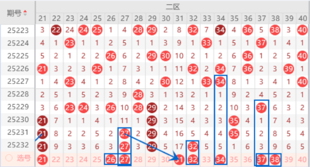 该区间的21号数字我们注意一下出现4重号的情况,本期可以防守一下21 28号数字同出的情况。连号空一带号23 24 26号数字已经断号3期了,本期我们注意一下出一个号码的情况,其中的23 26号数字我们可以重点关注一下出号情况。本期的27号数字我们注意一下出三重号码的情况,本期的可以防守一下26 27号数字同出的情况。本期的37 38 39 40号数字我们注意一下出号情况,其中的37 38号数字我们重点关注一下出号情况。