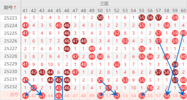 该区间的43号数字我们注意一下出号情况,属于三斜连号码,本期的45号数字我们也是要注意出三重号的情况,所以本期可以防守一下43 45号数字同出的情况。上期开出了51号数字,本期我们注意一下走分边的情况,所以本期的50 52号数字我们要注意出一个号码的情况,其中的50号数字可以重点关注一下。本期的58 60号数字都是属于三斜连号码,本期是有机会出一个号码的情况,其中的60号数字我们可以重点关注一下出号情况。
