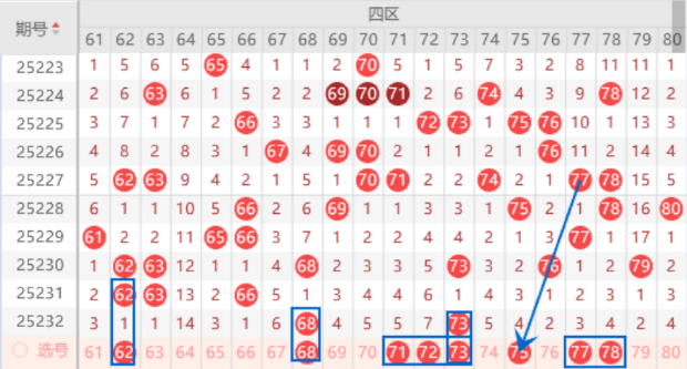 该区间的62 63号数字我们注意落下一个号码的情况,其中的62号数字我们可以重点关注一下。本期的68号数字我们注意一下出重号的情况,本期可以防守一下68 71号数字同出的情况。本期的70 71号数字我们也是要注意出一个号码的情况,其中的71号数字可以重点关注一下,本期可以防守一下71 73号数字同出的情况。本期的75号数字是属于三斜连号码,出号机会是有的,我们可以关注一下。本期的77 78号数字我们注意出一个号码的情况,其中的78号数字可以重点关注一下。