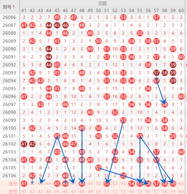 而三区的打底号.43.46.48.51.54.55.56.57.58.59中参考3-4码开出机会,