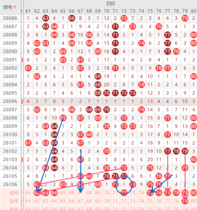 四区间关注的打底是61.62.63.67.72.75.76.77.78.79中参考3-4码开出机会
