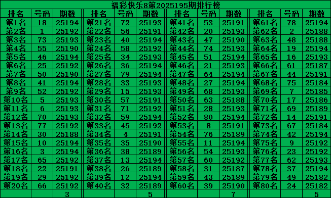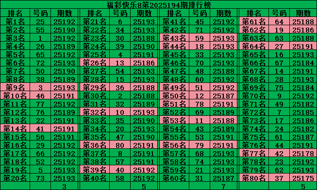 最后再把号码分为五区:一区01-16号、二区17-32号、三区33-48号、四区49-64号、五区65-80号,理论上每个区每期应该开出4个号码,2025194期五区比例:5:3:6:3:3