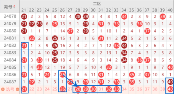 本期的21号数字我们注意一下出号情况,可以做一下防守的。上期开出了27 29 31 33 35号数字,本期这里我们是要做重号和夹号的,重号重点关注一下29 33号数字的出号情况,夹号重点关注一下30 32号数字的出号情况,28号数字本期太热了,有点不敢做。本期的30号数字是属于遗漏12期的冷号,本期有2个,出一个的机会是有的。本期的40号数字我们注意一下出重的情况,如果本期的80号数字出重了,那么本期的40号数字就没有了。