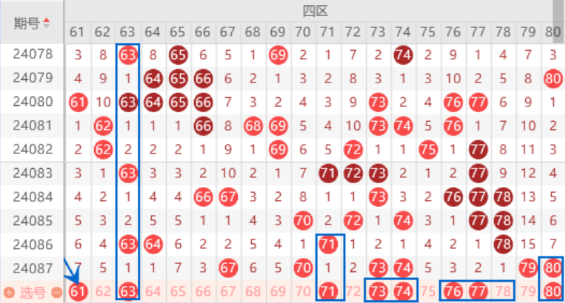 本期的63号数字我们重点关注一下,属于1221走势,最近这种走势出号率还是很可观的。上期开出了73 74号数字,本期我们注意一下出一个重号的情况。上期开出了73 80号数字,本期的76 78号数字我们注意出一个号码的情况。上期开出了79 80号数字,本期我们注意一下出一个重号的情况,重点关注一下80号数字走重的情况。本期的77号数字我们可以关注一下,可以防守一下57 77号数字同出的情况。