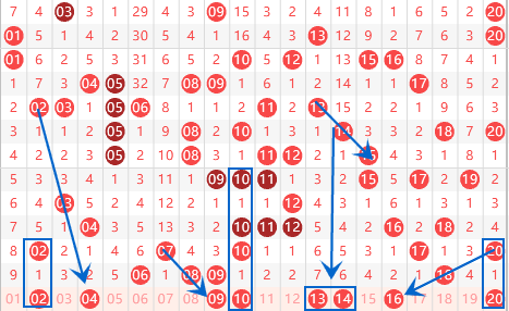 该区间的04号数字我们可以关注一下,它和02 03形成了三斜连。上期开出了08 09连号,本期我们要注意走重的情况。三斜连号码13 14 15本期我们要注意落下号码的情况,重点注意一下13 14的出号情况。上期开出了18号数字,本期我们注意注意一下16 20号数字的出号情况。