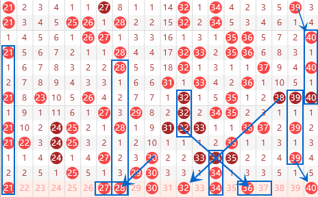 本期的21号数字是属于212走势,本期可以关注一下。本期的27号数字是属于空三中心号,本期的空三中心号有4个,本期最少要出一个的,我们可以重点考虑抓一个胆码出来的。本期的30 34号数字我们要注意走3重的情况,重点关注一下34号数字走三重的情况。本期的40号数字我们可以关注一下,39空一对称之后在空一有机会带出40号数字来。