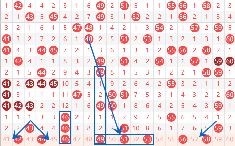 上期开出了43号数字,本期我们要注意一下42 44号数字的出号情况。46号数字我们可以关注一下走三重的情况。49号数字是属于空二对称,本期可以关注一下。48 53都是属于遗漏8期的号码,本期我们要防守一下它落下一个号码的情况。上期开出了59号数字,本期我们关注一下58号数字的出号情况。