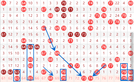 上期开出了三连号61 62 63,我们要注意走重的情况。本期的65号数字我们要防守一下,本期不出下期出的概率就大了。本期70号数字我们要注意走重的情况,毕竟上期70 80同时出现了,所以本期出现一个重号的机会还是比较大的。本期的73 74我们要注意一下,两个号码都是三斜连号码,出一个还是有必要的。