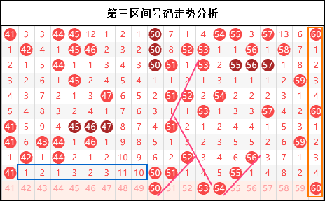 第三区间思路:三区不仅没有出现预期的回补走势,更是直接将前半部分的走势一下子消失殆尽。按照周期出现的多码趋势并没有在三区出现,那这个走势一下子就全部乱套了。差一点断掉的四字头是不是感觉很熟悉的走势,这在三区前期的五字头中曾经出现过类似的走法,而下一期中也并没有出现如期的多码回补,不过号码开在空白位置的走势倒是显而易见的,所以本期三区还是有点不错的走势去大有作为的。
