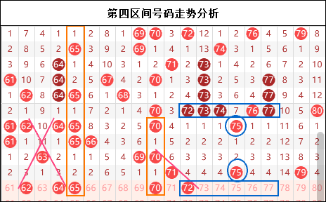 第四区间思路:四区现在这个走势与三区简直是藕断丝连,三区四字头仅仅开出一码,四区紧接着就将六字头全部消失,简直是有过之而无不及。参照六字头趋势回补的可能性相当不错,不过同区间中七字头在隔期回补中并没有如期出现,相反从此一骑绝尘走势不复存在。所以当三四区再一次出现这种走势的时候,说实话真的是相当犯难的一期。不过本期我们可以重点关注一下蓝色部分的划线,如果思路成立吗,本期这将是一匹超级黑马的存在。