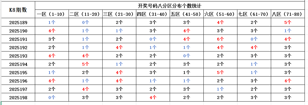 首先看上期回顾,“快乐8”第25198期开奖结果:11.13.16.21.24.28.33.34.37.38.43.44.53.59.61.62.68.71.73.77;通过分析开奖号码,分享第一个数据分析:统计开奖号码的八分区冷热走势,判断出号规律。上期开奖号码八分区走势较热的区间:四区,区间号码开出4个;走势较冷的区间:一区,区间号码开出0个。以近10期开奖号码的八分区统计数据为例: