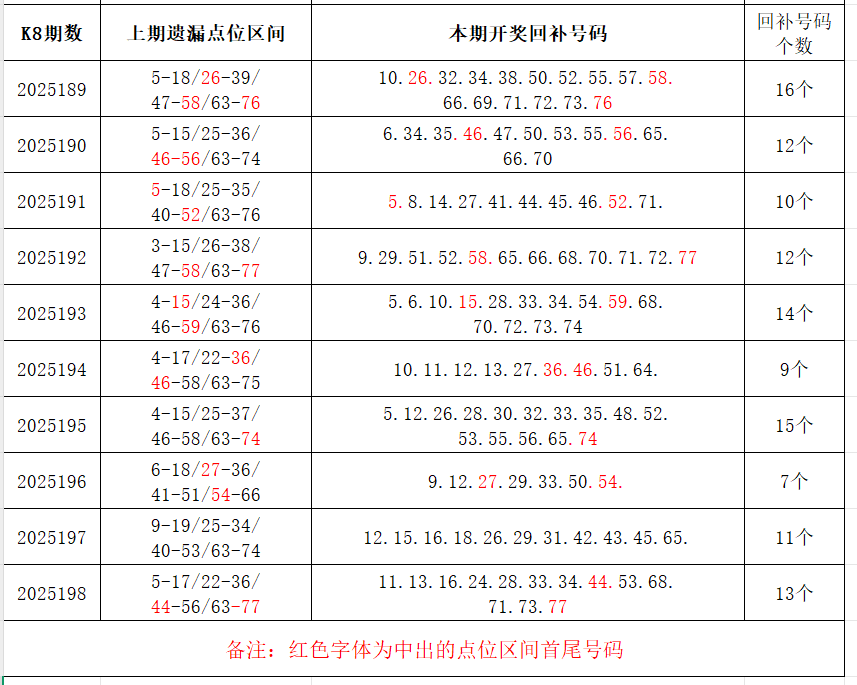 如图,上期的遗漏号码在下期开出10个左右,即为回补号码。定准点位区间首尾号码是关键!以上期2025198期(会员专区数据)为例,定位4个遗漏区间,围中13码!结合上期开奖号码,以跨度值大于或等于7为依据,本期关注2个遗漏区间:1-11/44-53;重点关注遗漏-区间:****(会员专区可见),区间遗漏号码可能在本期回补开出。注意区分遗漏区间回补号码和大底号码,不要混淆。个人分析,仅供参考。