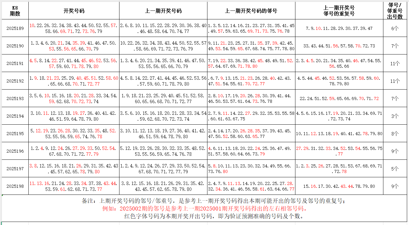 如图,红色字体是上期邻号、邻重号在下期开出,每期开出10个左右。上期邻号开出6个,邻重号开出3个。本期参考邻号:10.14.15.17.20.22.23.25.27.28.32.35.36.39.42.45.52.54.58.63.67.69.70.74.76.78;邻重号:12.33.34.37.38.43.44.60.61.62;个人分析,仅供参考。