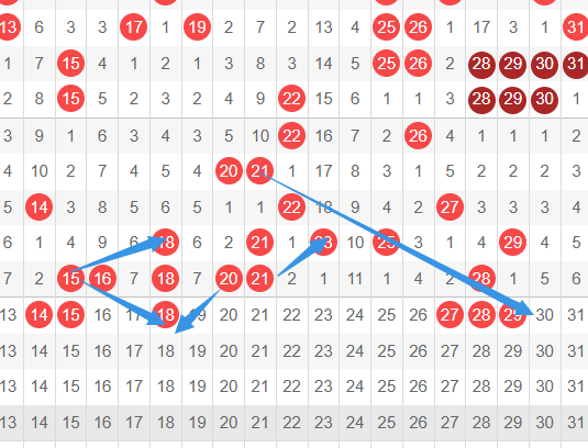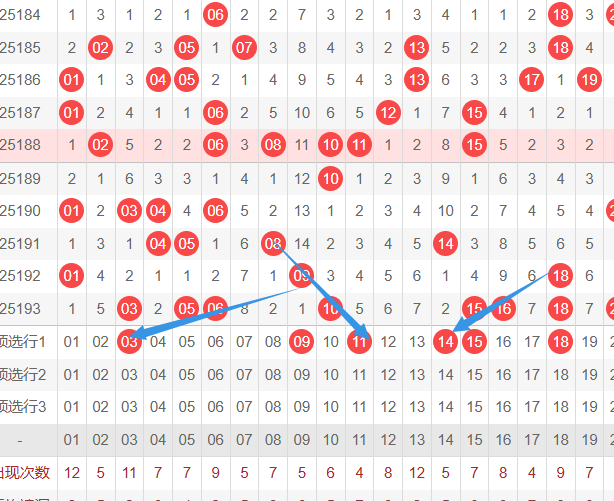 我们还是看一下这个重点号码的分析,第一个重点号码是03。这个重号主要是看好这个369这个斜连号码。这是第一个重点号码,一区的话还是有几个比较明显的斜连号。你比如说是09和11,都是属于斜连号,以及14号啊,都是斜联号码。两个重号15.18.和03,这是一区的一个分析情况