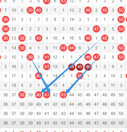 三字头的话,我们考虑一个38号,上一期的话,4字头断开了,本期考虑这个四字头会有回补的情况,那么回补的话,我们从这个斜连号的角度来看43号。是一个标准的一个斜连号,43.45.47那么再根据这个43的组合,我们就要考虑把这个40号给落下来,把这个40号给直落下来