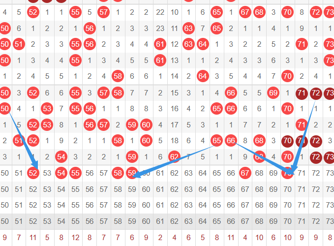 最后这张图的话,主要是分析50~70这20个号码中间可能会产生的一些号码,50号到70号之间,我比较看好的几个号码。这这个区间的话,还是最近几期比较活跃的一个段,那么首先看好的是70号是一个重复斜连号码,然后呢,要看一个59,也是59.62.65斜连号码,通过59的一个直落我们就可以看出。555859这样的组合就产生了,大家根据走势图的结构分析一下啊,去挑选心仪的号码啊,我比较看好的话就是55.58.59.67.70