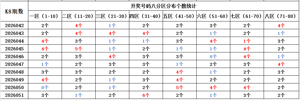 首先看上期回顾,“快乐8”第26051期开奖结果:6.7.9.20.21.28.31.32.33.34.36.39.41.47.56.62.65.70.71.77;通过分析开奖号码,分享第一个数据分析:统计开奖号码的八分区冷热走势,判断出号规律。以近10期开奖号码的八分区统计数据为例: