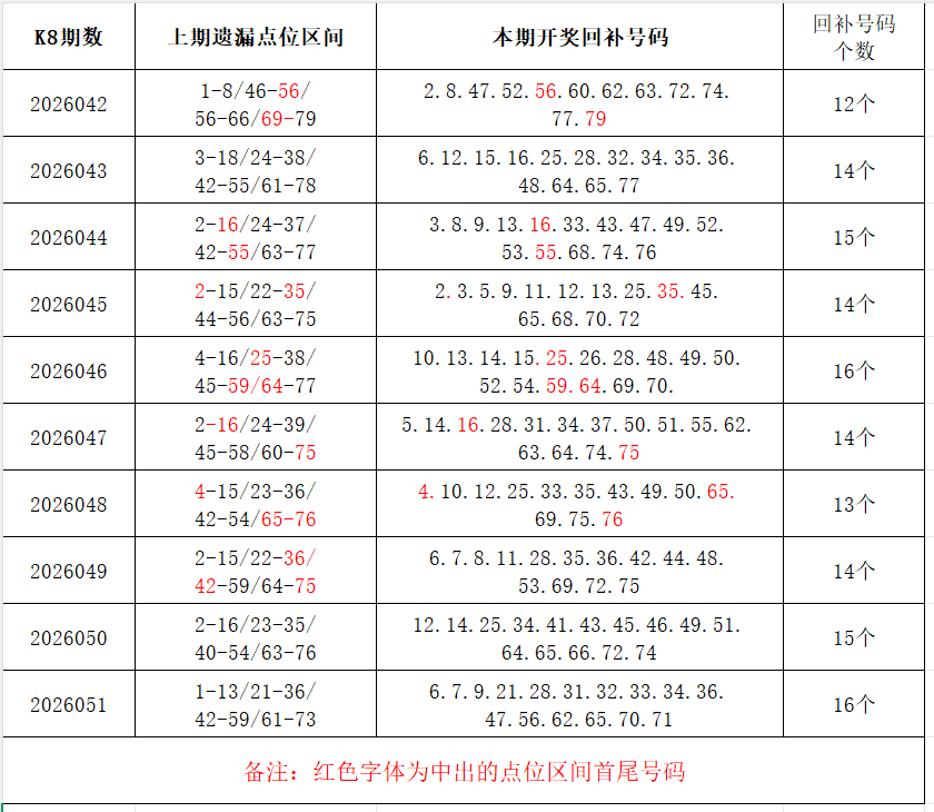 如图,上期的遗漏号码在下期开出10个左右,即为回补号码。定准点位区间首尾号码是关键!以上期2026051期为例,定位4个遗漏区间,围中16码!结合上期开奖号码,以跨度值大于或等于7为依据,本期关注3个遗漏区间:9-20/21-28/47-56;重点关注遗漏区间:5-18/23-35/40-56/63-78。点位区间号码和大底号码请勿混淆,个人分析,仅供参考。