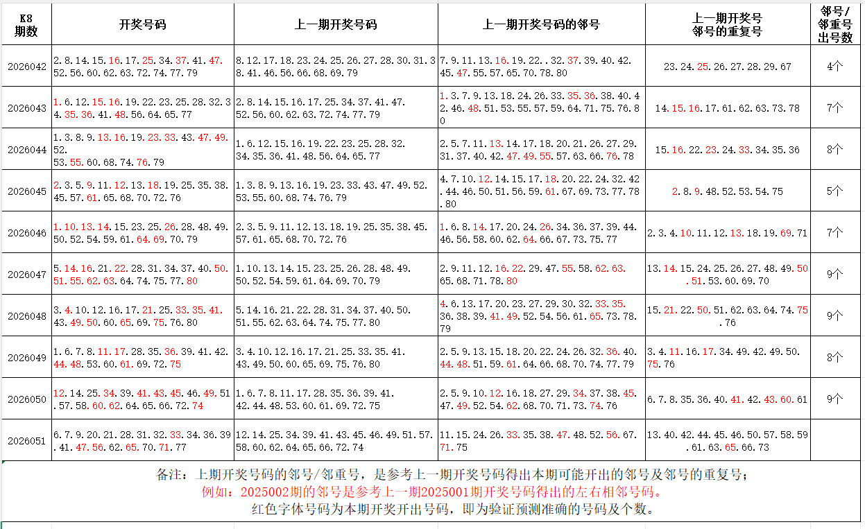 如图,红色字体是上期邻号、邻重号在下期开出,每期开出10个左右。上期邻号开出4个,邻重号开出1个。本期参考邻号:5.10.19.22.27.29.30.37.38.42.46.48.55.57.61.63.64.66.69.72.76.78;邻重号:6.7.8.20.21.31.32.33.34.35.40.70.71;个人分析,仅供参考。