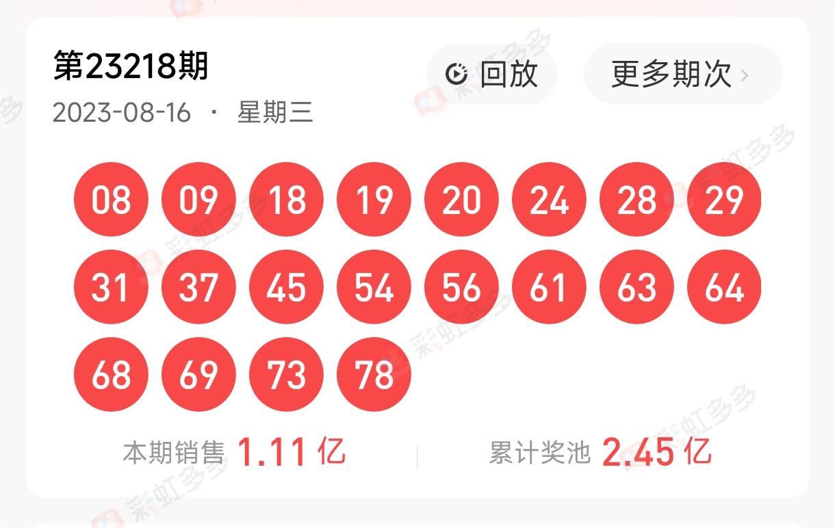 首先回顾上期的开奖号码:08 09 18 19 20 24 28 29 31 37 45 54 56 61 63 64 68 69 73 78