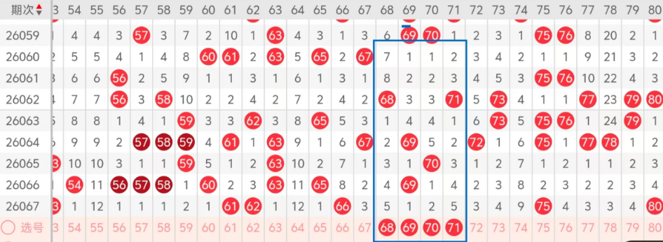 第四区间的走势分析:第四区间上期开出了五个号码球,主要的落号点位在四区间的前后半区,走出了两奇三偶的形态走势,上期四区间的前半区落下了三个号码球,后半区落下了两个号码球,整个四区间处于走热的趋势,根据四区间的走势规律,今天的四区间我们主看中间位置连码的落位,也是冷码的回补,主看68 69 70 71这几个号码球的落位,注意落下姊妹对和三连码的组合,这四个号球建议大家打个四码复三,或者打个四码复二比较稳妥,参考为主!