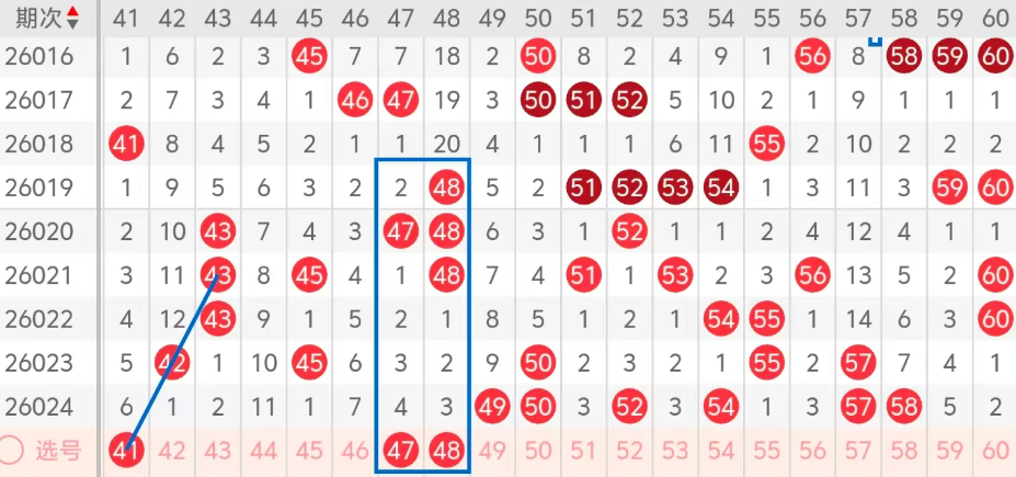 第三区间的走势分析:第三区间上期开出了六个号码球,主要的落号点位在三区间的后半区,走出了两奇四偶的形态走势,上期三区间的前半区落下了两个号码球,后半区落下了四个号码球,整个三区间处于走热的趋势,根据三区间的走势规律,今天的三区间我们主看前半区41这个号码球的落位,走出了斜连码的走势,再看47 48热码组合的回补,47走出了斜连码的走势,48走出了边码的落位,这三个号球建议大家打个三胆拖,或者打个三码复二比较稳妥,参考为主!