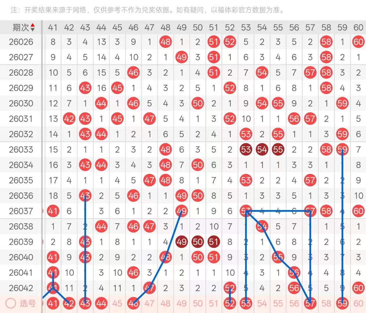 三区:三区间上期开出了5码,四字头部位置开出了41的3重,尾部位置空三回补的47,中部位置及尾部均处于放空状态。五字头开出头部位置52的十期遗漏下落,以孤码形态开出,中部位置九期遗漏做重56,尾部位置开出了60的孤码。本期四字头头部位置可优先考虑41的三重分边号码4042做二选一,其次防守414243444码开出连号,中部位置42与45两码十一期遗漏,可考虑一码开出,优先考虑42的下落。其次46在本期为空1空2,空一上下遗漏对称可考虑开出,尾部位置49-50做二选一。五字头头部位置优先考虑52孤码的分边号码,5153下落一码即可,56的双重分边防守57的开出。其次59的九期遗漏在本期也值得关注,以及六零的重码防守以对子形态开出。