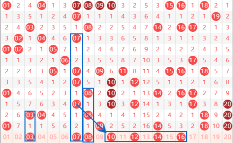 该区间的连号03 04本期我们要注意一下落号情况,可以考虑一下03号数字出号情况。本期的07号数字是属于212走势,我么可以关注一下。本期的10号数字我们也是要防守一下的,四斜连号还是有出号机会的。上期开出了14号数字,本期我们可以关注一下14 16号数字同出的情况了,14 16在近期同时出现情况是很频繁的,防守是没有错的。