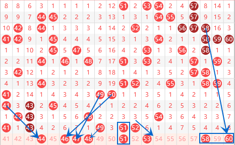本期的44号数字我们做防守就行了,出号机会不是很大,防守一下33 44同出的情况就行了。本期的46 47我们要重点考虑一下,这里出一个号码的情况是非常大的,不能放弃了,两个号码都是斜连号码,个人偏向于47号数字,所以本期我们可以注意一下47 56号数字同出的情况。连号空一带号49 51 52本期我们要注意落下重号的情况,重点考虑一下51号数出重的情况,本期的53号数字也是可以关注一下。55-60号数字区间也就同时遗漏4期没有落号了,所以本期这里最少应该会出2个号码,我们要重点考虑一下,可以抓两个号码出来的。