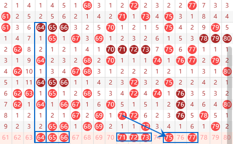 上期开出了连号65 66和连号68 69,本期这里我们是要做重号的,重点关注一下65 66走重的情况,68 69出重的机会不是很大。本期的71 72 73我们要注意出两个号码的情况,尤其是71 73出号的情况很大,可以防守一下,71号数字是属于空三中心号,73是属于重号,所以本期我们可以防守他们同出的情况。本期的75 76 77我们要注意出两个号码的情况,重点关注一下75 77号数字出号情况。