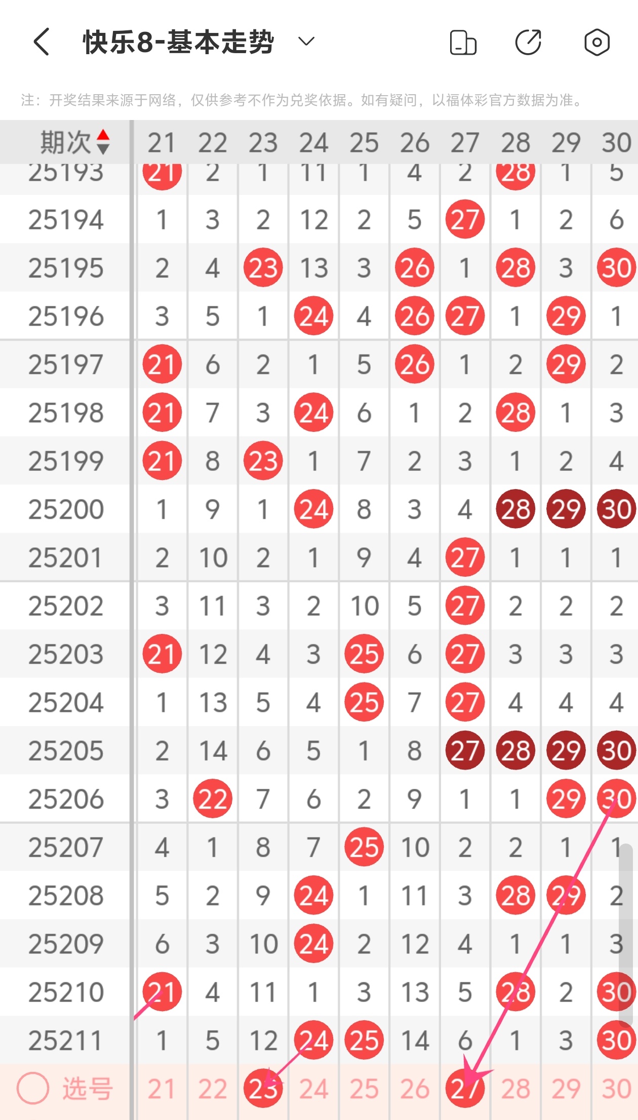 上期第三区间开出24 25 30,本期我们可以从上面走势图中看到选号的思路,本期推荐23 27