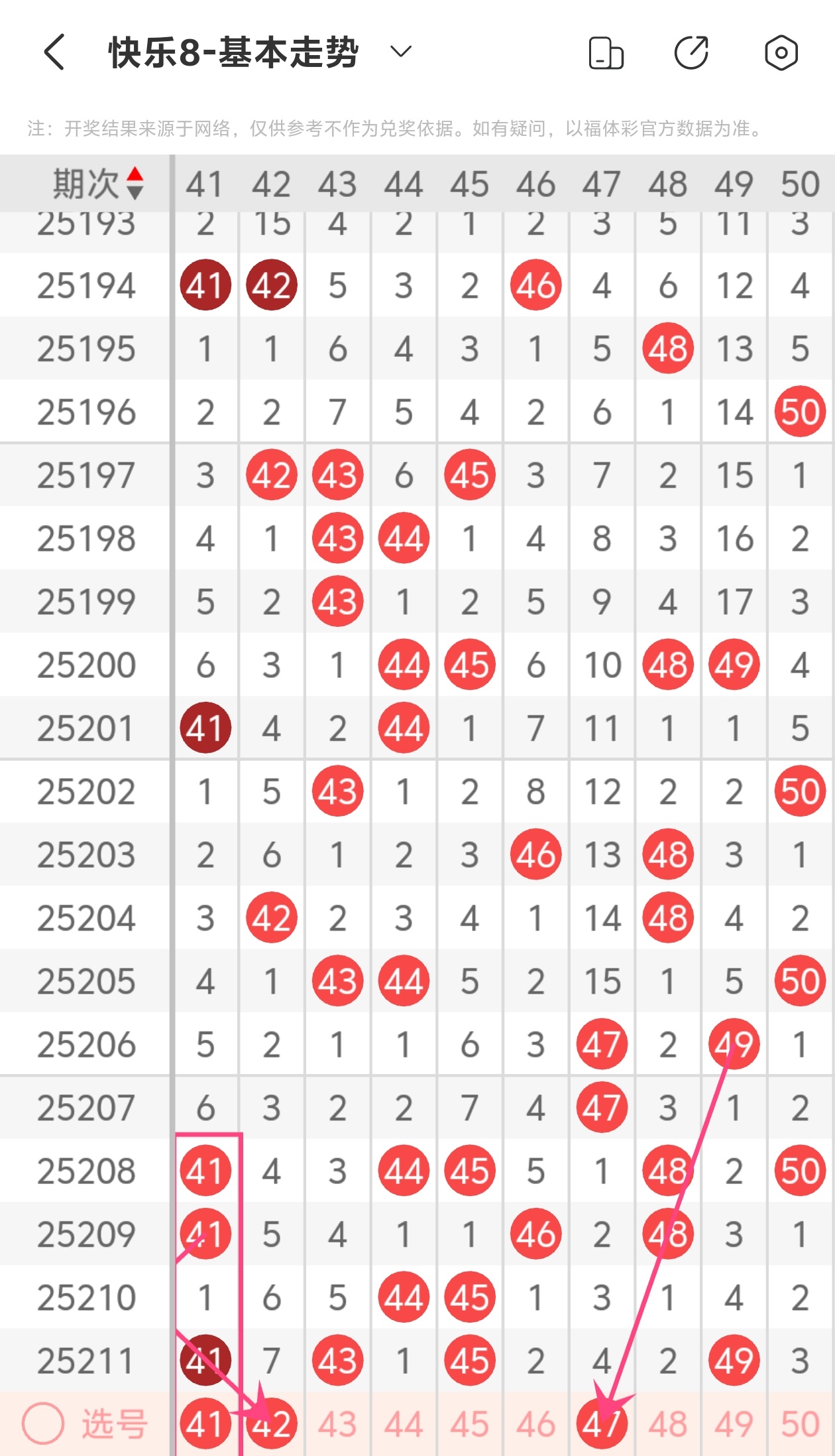 上期第五区间开出41 43 45 49,本期我们可以从上面走势图中看到选号的思路,本期推荐41 42 47