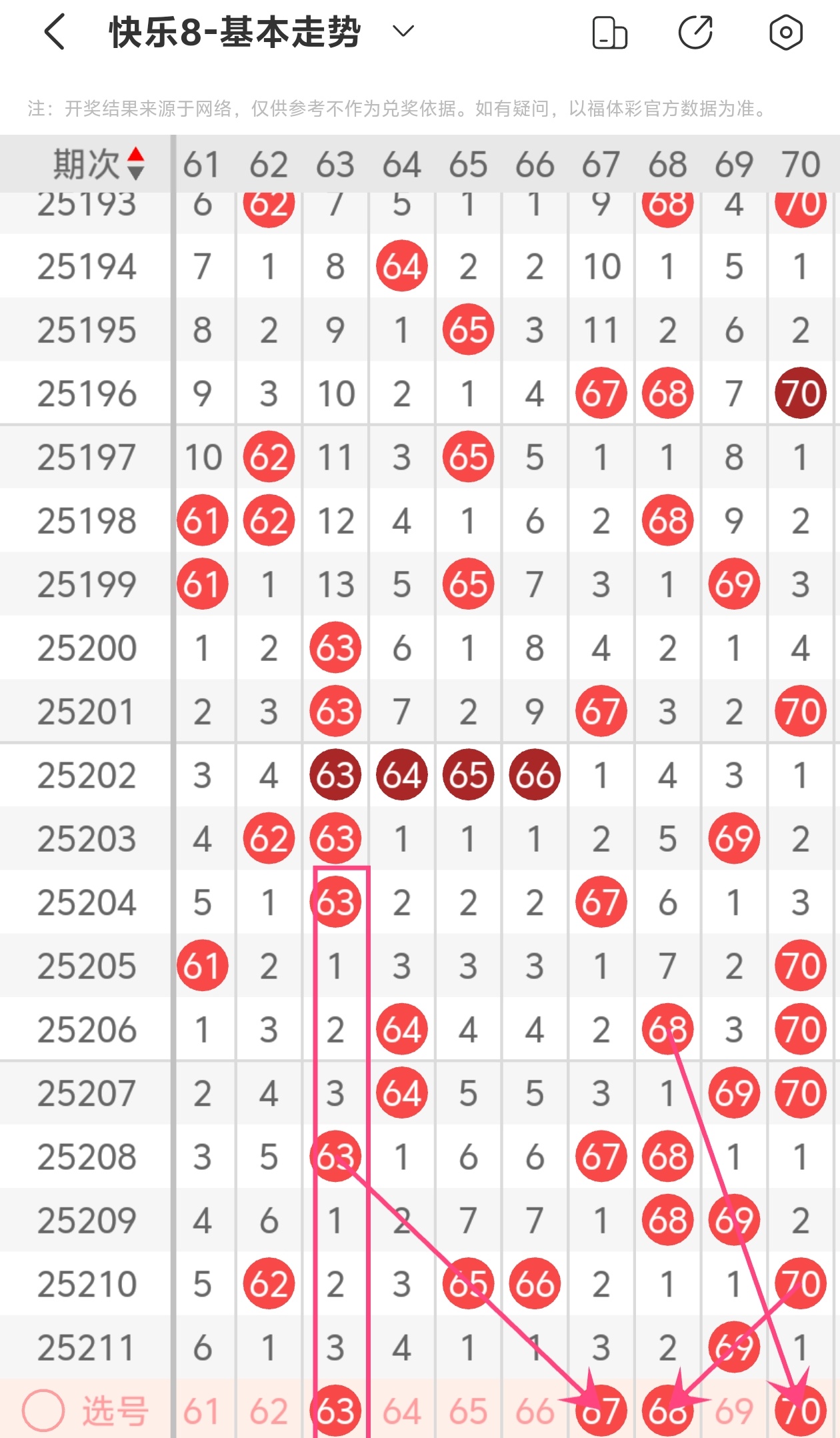上期第七区间开出69,本期我们可以从上面走势图中看到选号的思路,本期推荐63 67 68 70