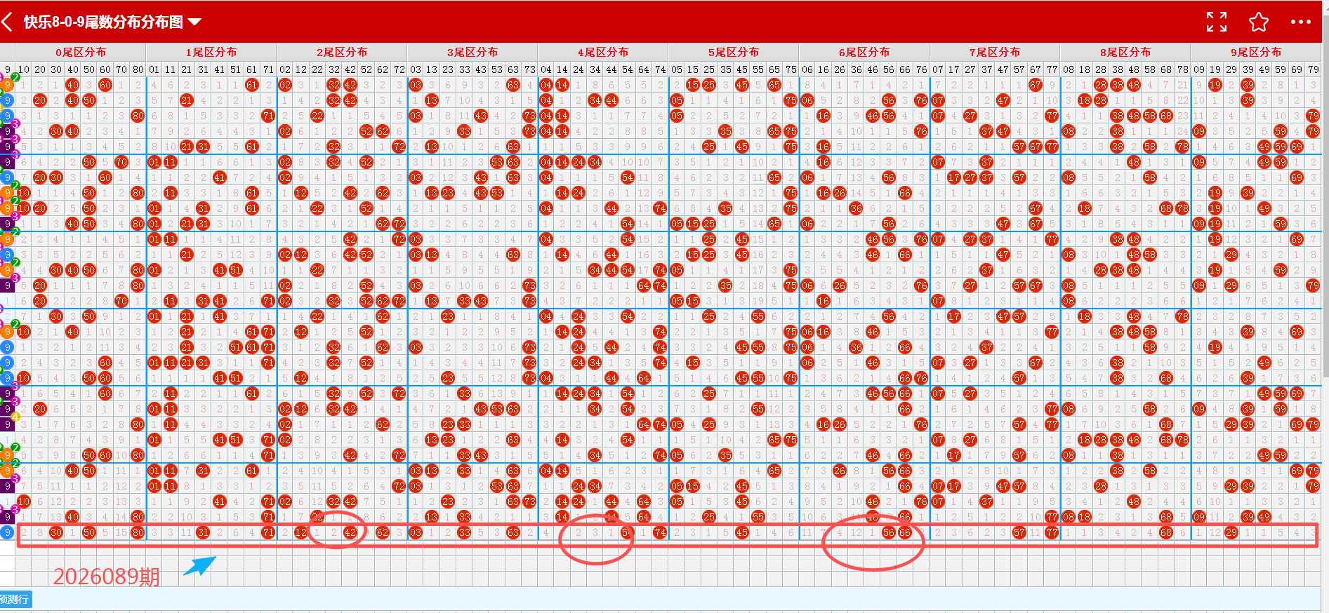 上图是快乐八2026089期的尾码走势图,从图中看0尾到9尾出号个数依次是:0尾号码区开出3个;1尾号码区开出2个;2尾号码区开出3个;3尾号码区开出3个;4尾号码区开出2个;5尾号码区开出1个;6尾号码区开出2个;7尾号码区开出2个;8尾号码区开出1个;9尾号码区开出1个;再看小尾号码(0尾-4尾)区有13码,大尾号码(5尾-9尾)有7码;数据比对统计后可以看到本期0、2、3尾出号数量最多,一共开出了9个中奖号码。本期没有尾区出现断区!由走势比对推断2026090期重点需要关注2、4、6尾区号码下号热度回补和落号数量增加的概率较大。