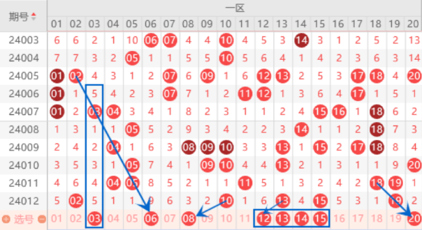 该区间的03号数字是属于空五对称号码,我们要注意一下。上期开出了10号数字,那么本期的08号数字我们就要注意一下了,是有机会把08号数字带出来的。本期的12号数字我们注意一下,上期开出了13号数字,很有可能会把12号数字带出来的。上期开出了13 33 53号数字,本期我们注意一下出一个重号的情况,这里是有很大机会重一个号码的。本期的14号数字我们注意一下,属于空4对称,本期的控4对称号码有3个,是有机会出一个号码的。