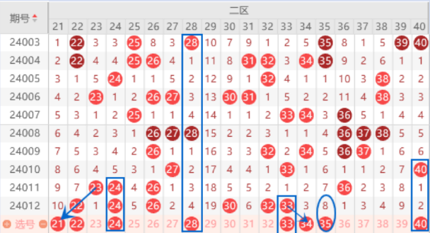 该区间的21号数字我们注意一下出号情况,毕竟遗漏10期的号码好久没有出号了,本期是有机会出来的。上期开出了22 24 26号数字,本期我们注意出一个重的情况,重点关注一下22 24号数字出重的情况。上期开出了30 32 33号数字,那么本期我们就要注意一下出一个重号的情况了,重点关注一下32 33号数字出重的情况。本期的35号数字是属于遗漏8期的号码,本期遗漏8期的号码应该是要出一个号码的,我们需要注意一下。