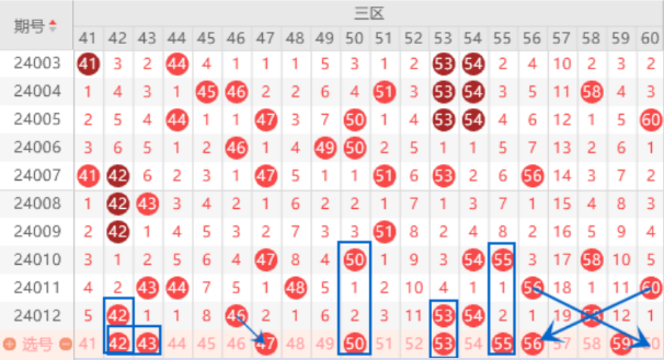 该区间的42号数字我们注意一下走重的情况,重点关注一下。本期的47号数字是属于空二对称号码,可以做一下防守47 50号数字同出的情况。上期开出了53 54号数字,本期我们注意一下出一个重号的情况。本期的56 60号数字是属于空三中号,本期的空三中心号有五个为17 28 44 56 60号数字,本期最少是要出一个号码的,我们重点关注一下28 56 60号数字的出号情况就行了。