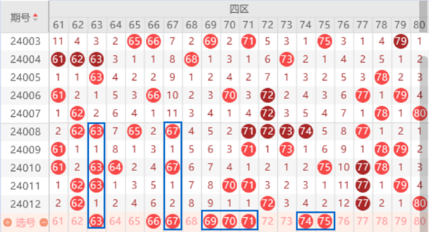 该区间的63号数字我们注意一下,有可能会复制60号数字的走势,可以做一下防守的。本期的67号数字我们注意一下出号情况,走的是66 68号数字的走势,出号机会还是有的。本期的69号数字是属于遗漏9期的号码,本期遗漏9期的号码也是有三个,本期是有机会出一个号码的,我们重点关注一下06 69号数字的出号情况。本期的75号数字我们注意一下,属于262走势,出号机会也是有的。