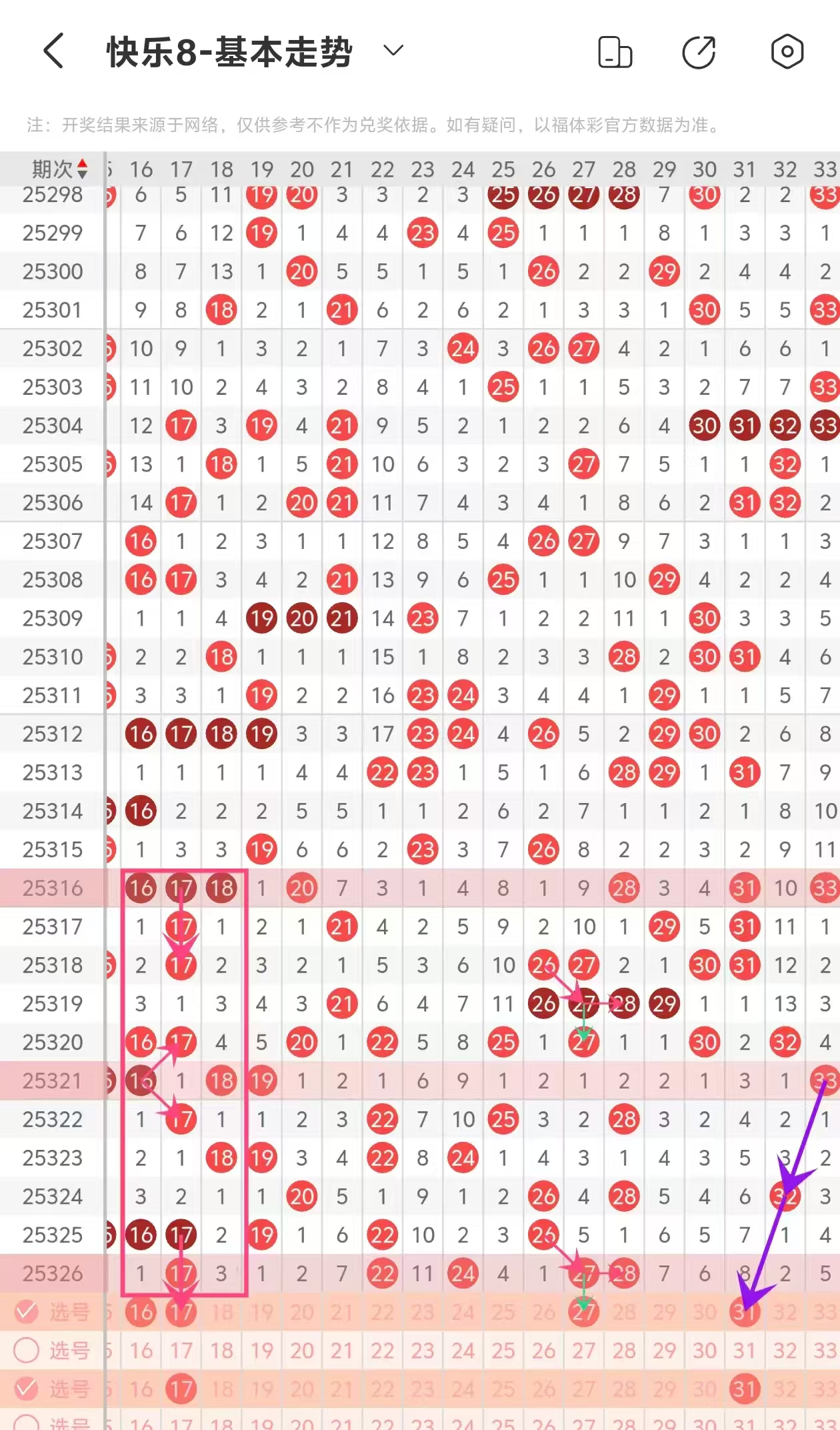如上图,我用工具画出了长方形我们看里面的数字16,17,18,还是挺有规律的,五五开的样子,如图17有3连号的趋势,用箭头画出,所以把17作为今天的金胆推荐,16做为大底的一部分,后面的27也有作为连号的趋势,用箭头画出了规律所以选27,31呈现出斜空连开的趋势,所以上图的大底是16,17,27,31(我选出大底,你们可以自行挑选组号),接下来我们看第二区域
