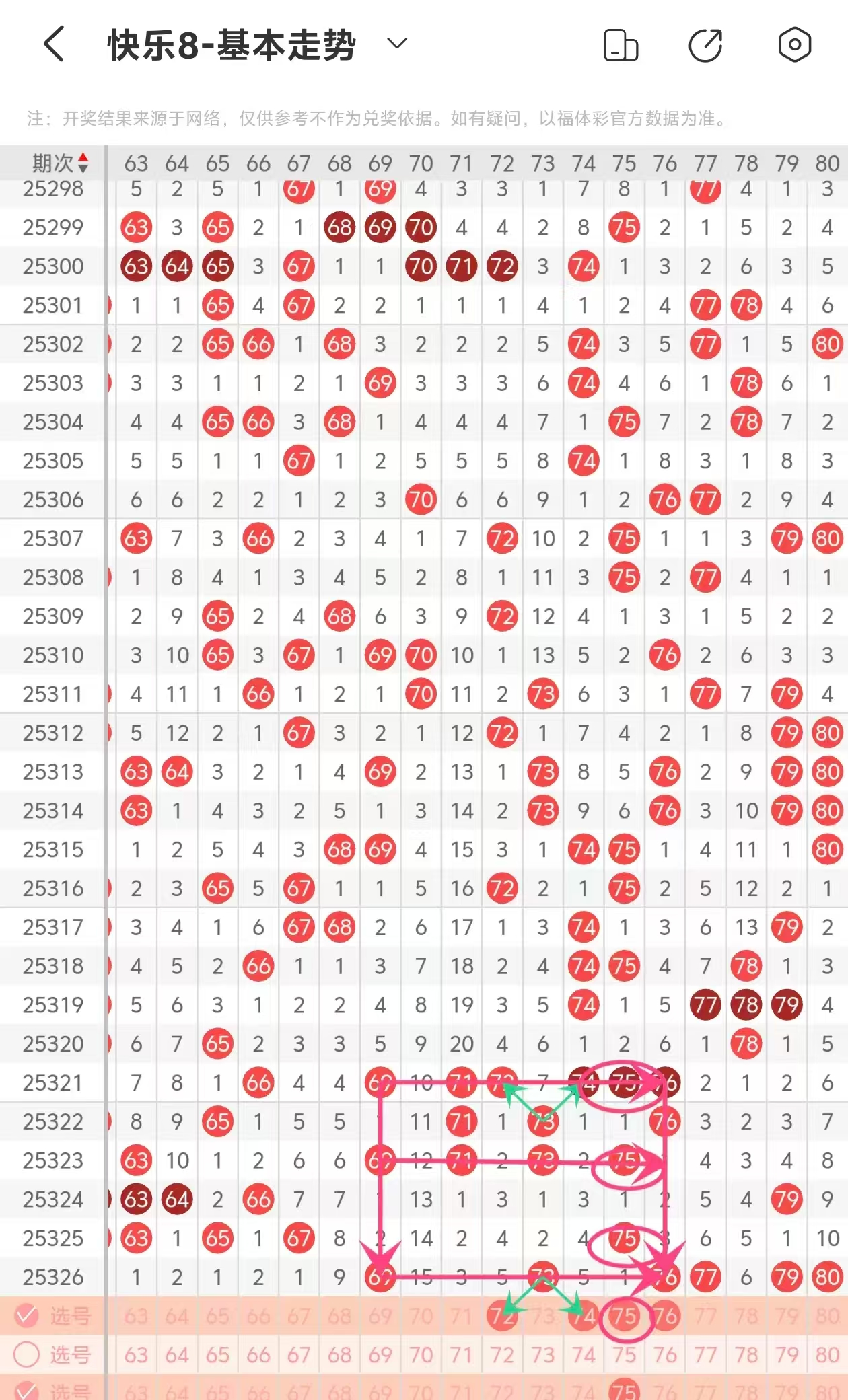 如上图69到76,我用箭头画出它的规律分析,72和74会沿着73斜开,75是隔一期开隔一期开趋势,76作为旁边大底,铜胆推荐75