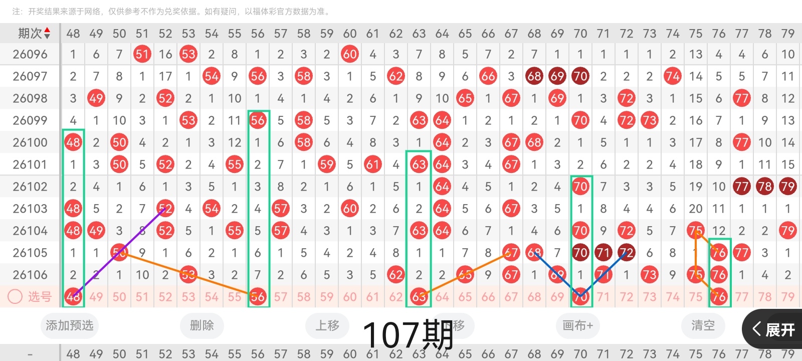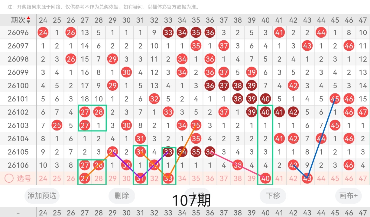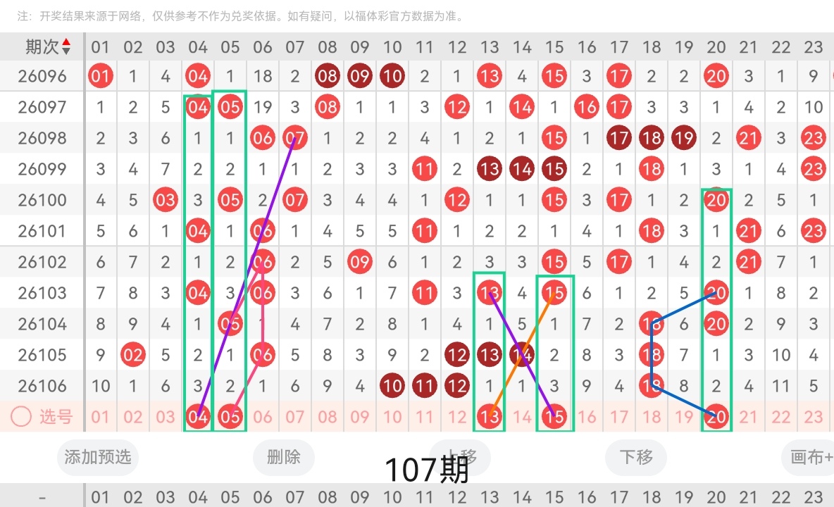 通过以上对上期的简单回顾,下面进入2026107期(下面简称本期)的选号分析:
